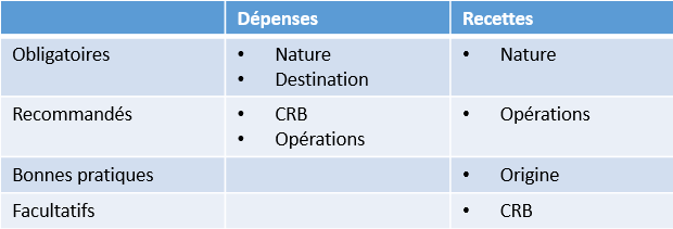 - Les différents axes budgétaires doivent être paramétrés (nature, destinations/origines, analytique…).
