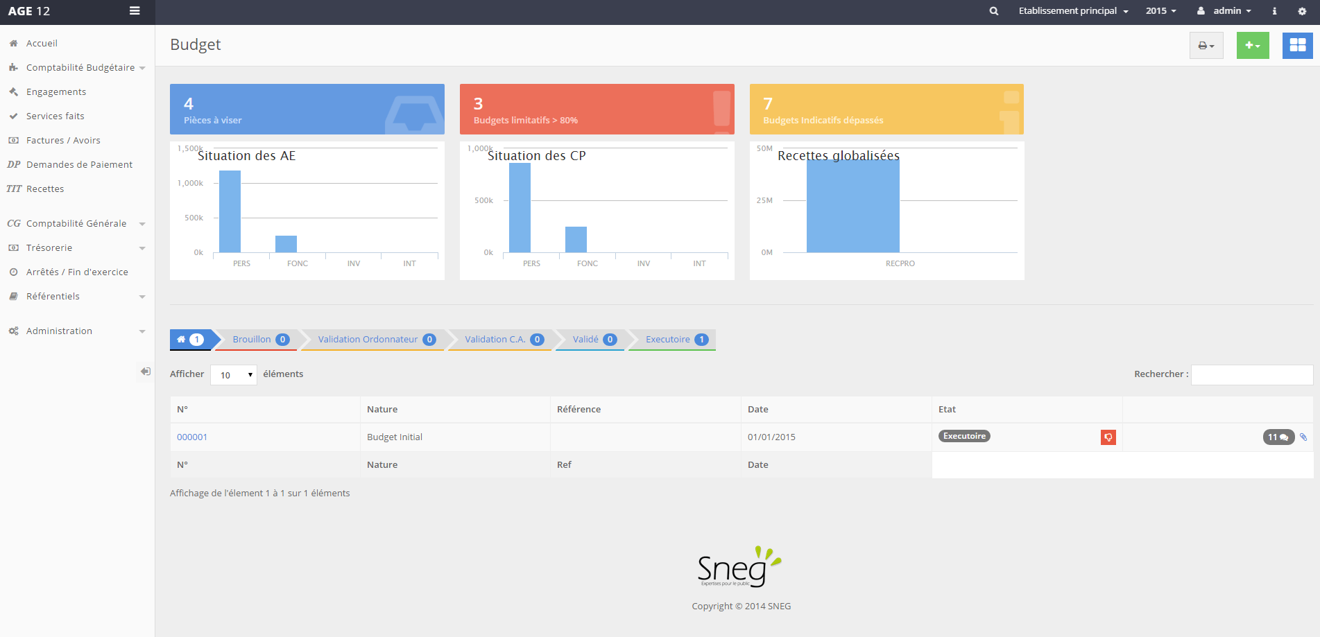 L’enregistrement du budget initial se fait par simple clic sur le bouton d’enregistrement en haut à droite de l’écran (boutons d’action). Les données sont alors visibles par tous les utilisateurs.