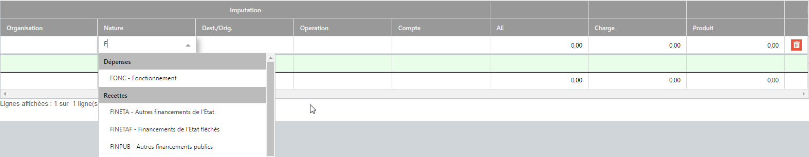 Dans le tableau des lignes de B.P., un simple clic dans une cellule active le mode de saisie et un assistant s’ouvre. La rédaction d’une valeur filtre au fur et à mesure la liste proposée par l’assistant. Cette liste ne propose que les codes des axes déclarés “actif et saisissable au budget”.