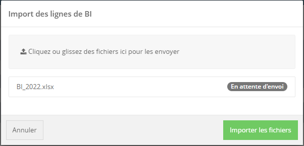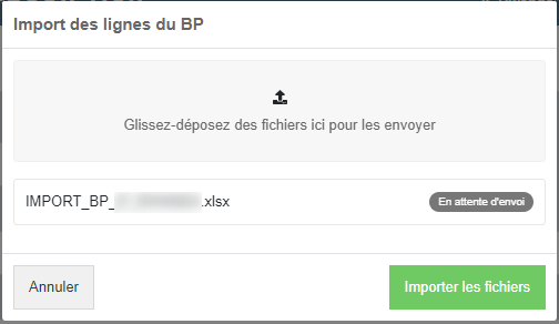 Glisser le fichier exporté du B.P. dans l’encart d’import et cliquer sur ‘Importer les fichiers’.