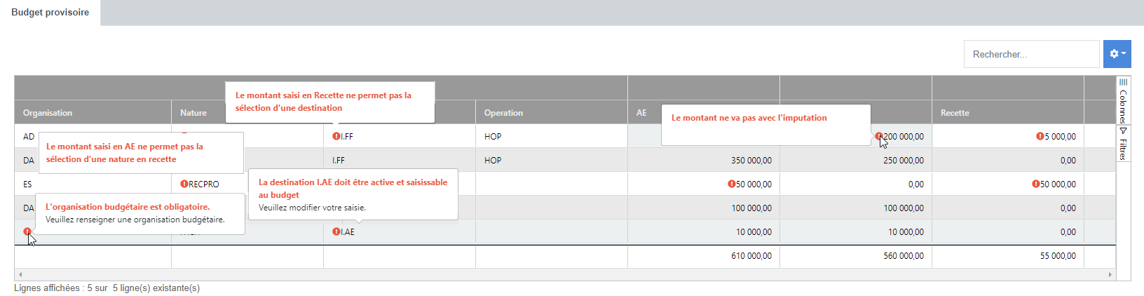 Lorsqu’une ligne du B.P. n’est pas renseignée correctement, l’application en informe immédiatement l’utilisateur par des pictogrammes rouges. En positionnant la souris au-dessus de ces pictos, une info-bulle indique la nature de l’anomalie.