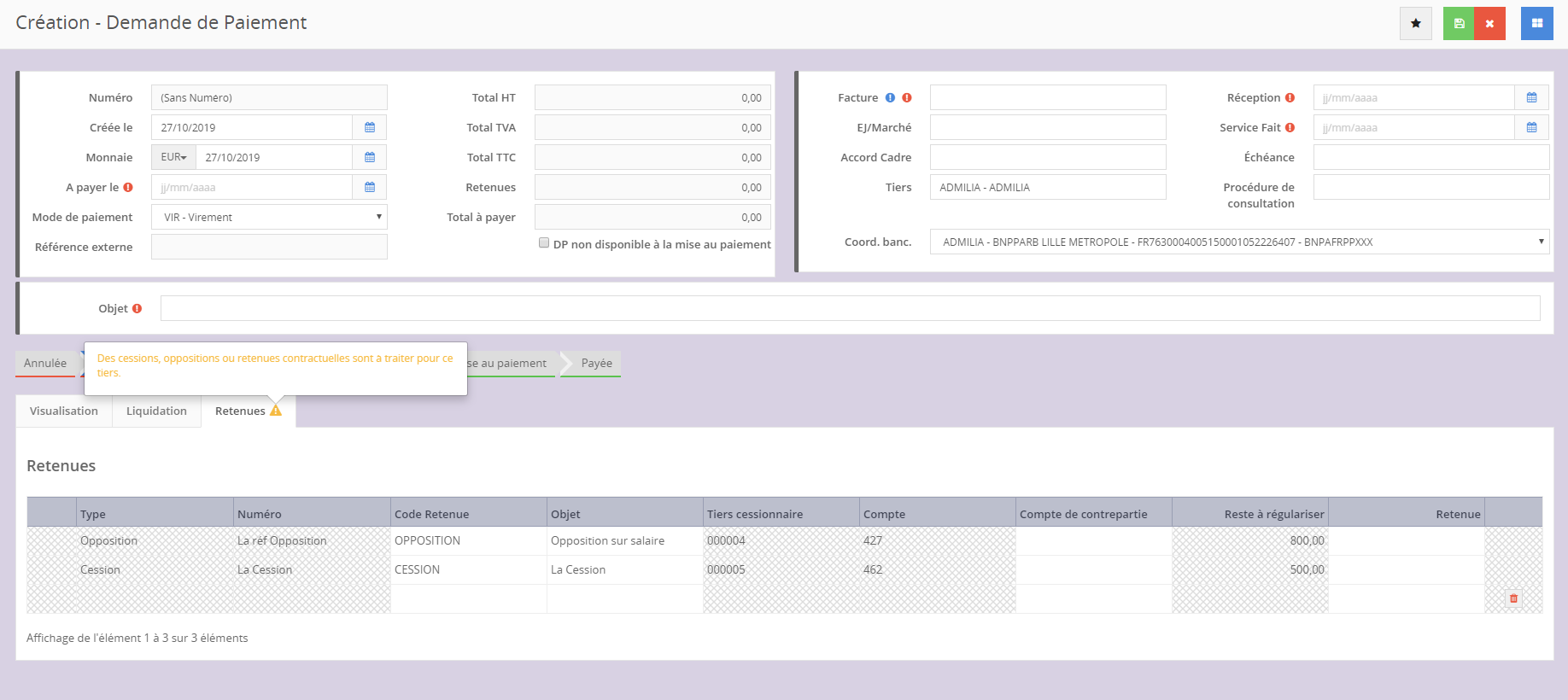 Après avoir saisi le tiers dans la DP, un pictogramme d’alerte apparaît sur l’onglet retenue, informant de la présence d’une cession/opposition.