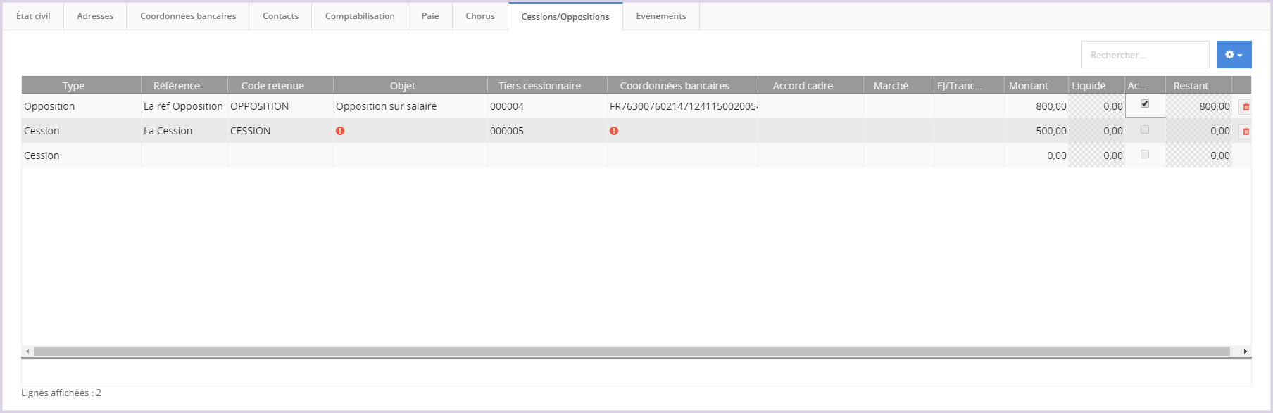 1. Saisir les lignes de cession/opposition dans la fiche tiers