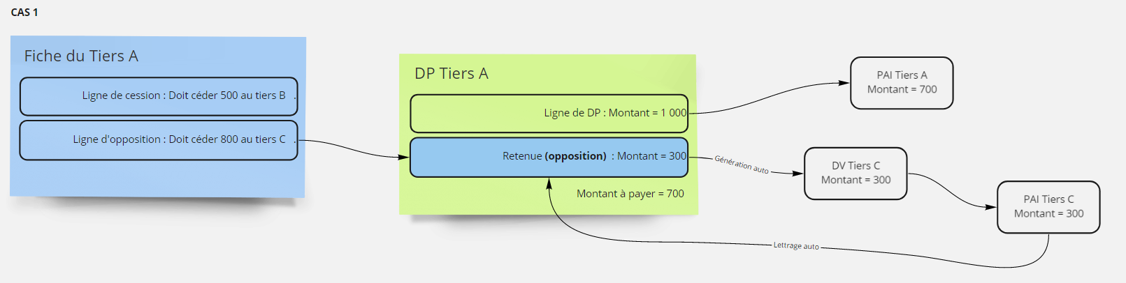 La liquidation d’une ligne de cession/opposition dans la DP est strictement identique à la liquidation d’une retenue classique et vient impacter le montant à payer au tiers de la même manière.