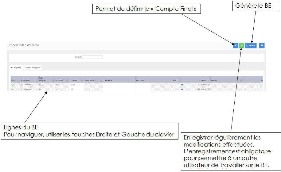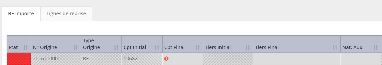 Si le compte ou le tiers importé n’est pas identifié avec un élément du référentiel AGE, la ligne apparait en anomalie. Dans ce cas il convient de saisir la valeur Compte Final ou Tiers Final.