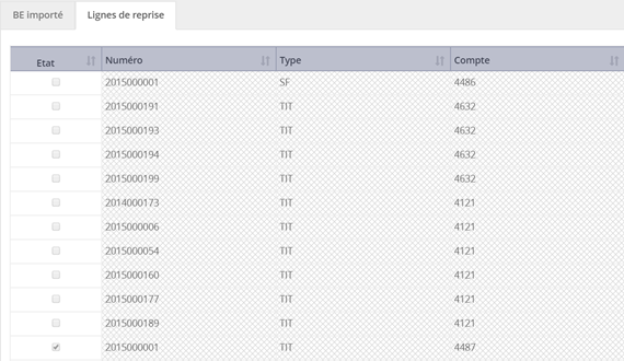 Dans l’onglet «Lignes de reprise», vérifier que toutes les lignes sont cochées (ce qui signifie qu’elles sont correctement rattachées). Cette liste contient toutes les pièces (SF et Titres saisis sur l’exercice 2015 d’AGE12).
