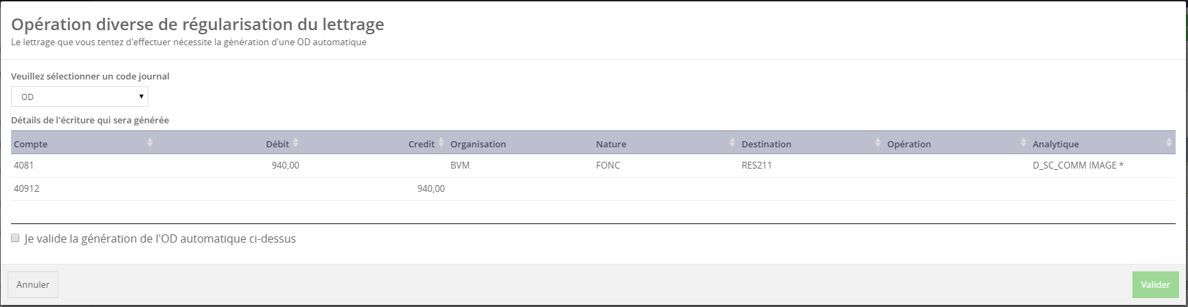 Si les lignes à lettrer sont en inadéquations, l’application propose une écriture d’OD automatique permettant de procéder au lettrage.