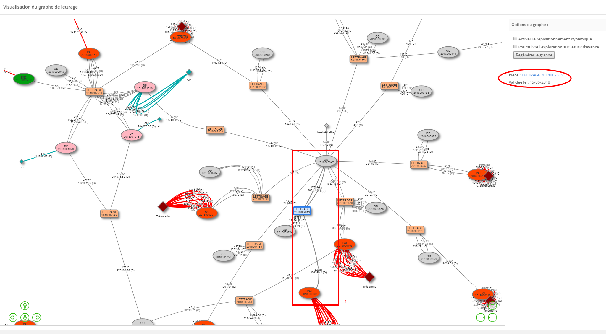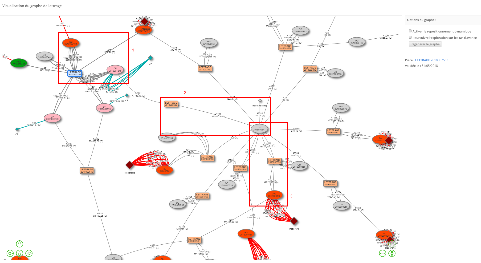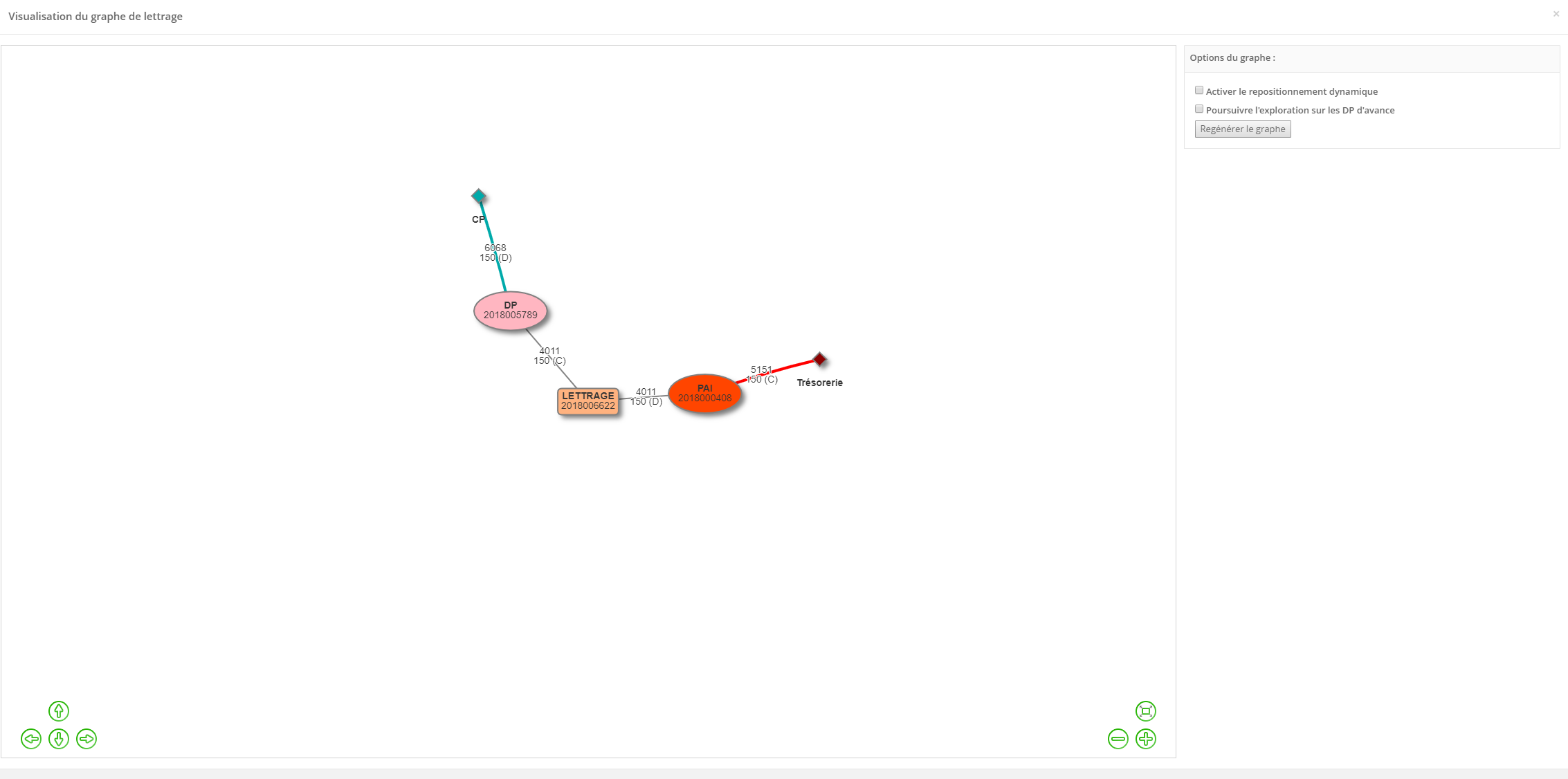 Ce graph de lettrage permet de visualiser les pièces liées ensembles, et donc d’en comprendre les impacts. Il est accessible depuis l’écran de délettrage.