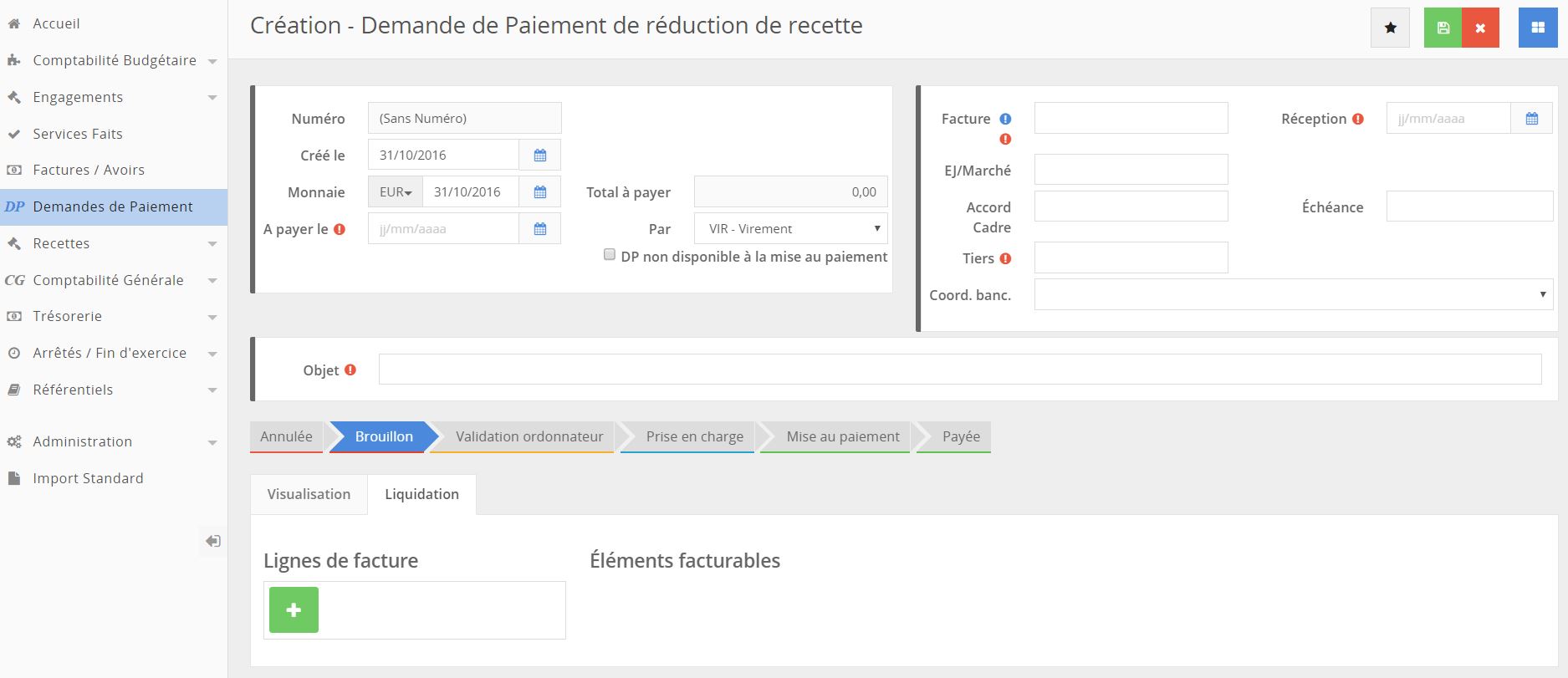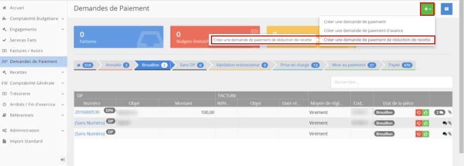 Pour créer une demande de paiement de réduction de recette, cliquer sur le bouton vert “+” en haut à droite