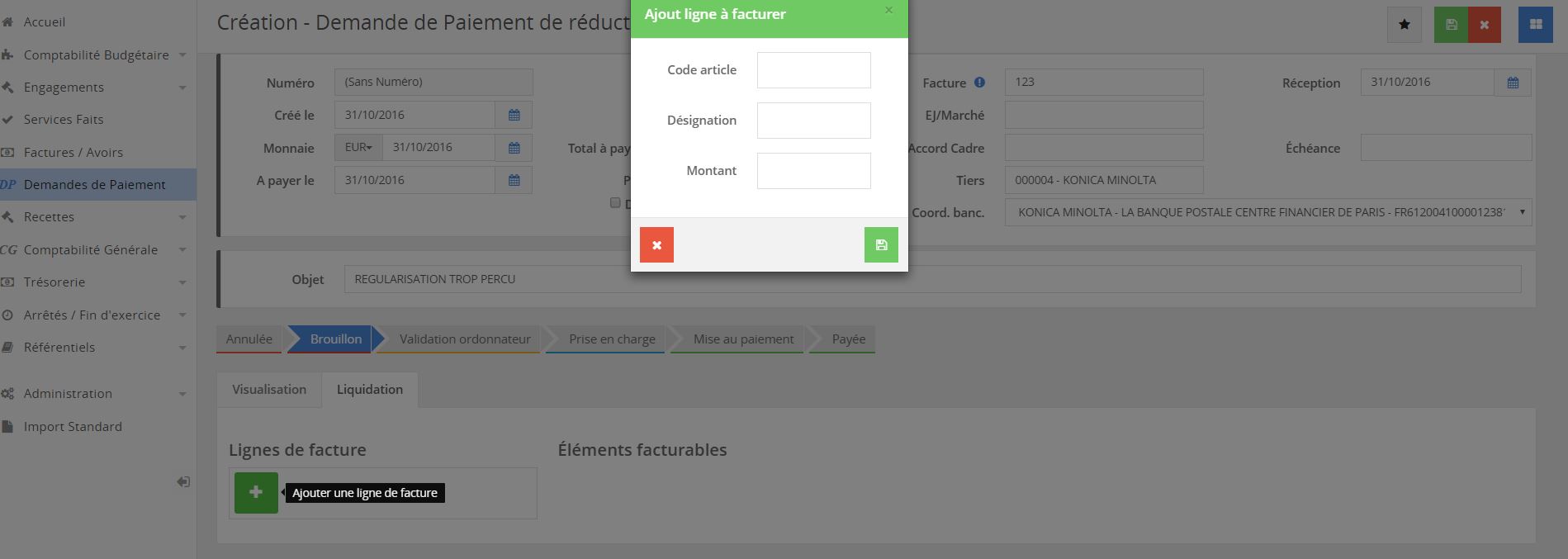 Compléter ensuite les champs de la pop-up qui s’affiche puis cliquer sur le bouton “Enregistrer”. Dans la zone “Eléments facturables” (en bas à droite), les cellules “désignation”, “montant”, “compte” et “axes budgétaires” sont à renseigner.
