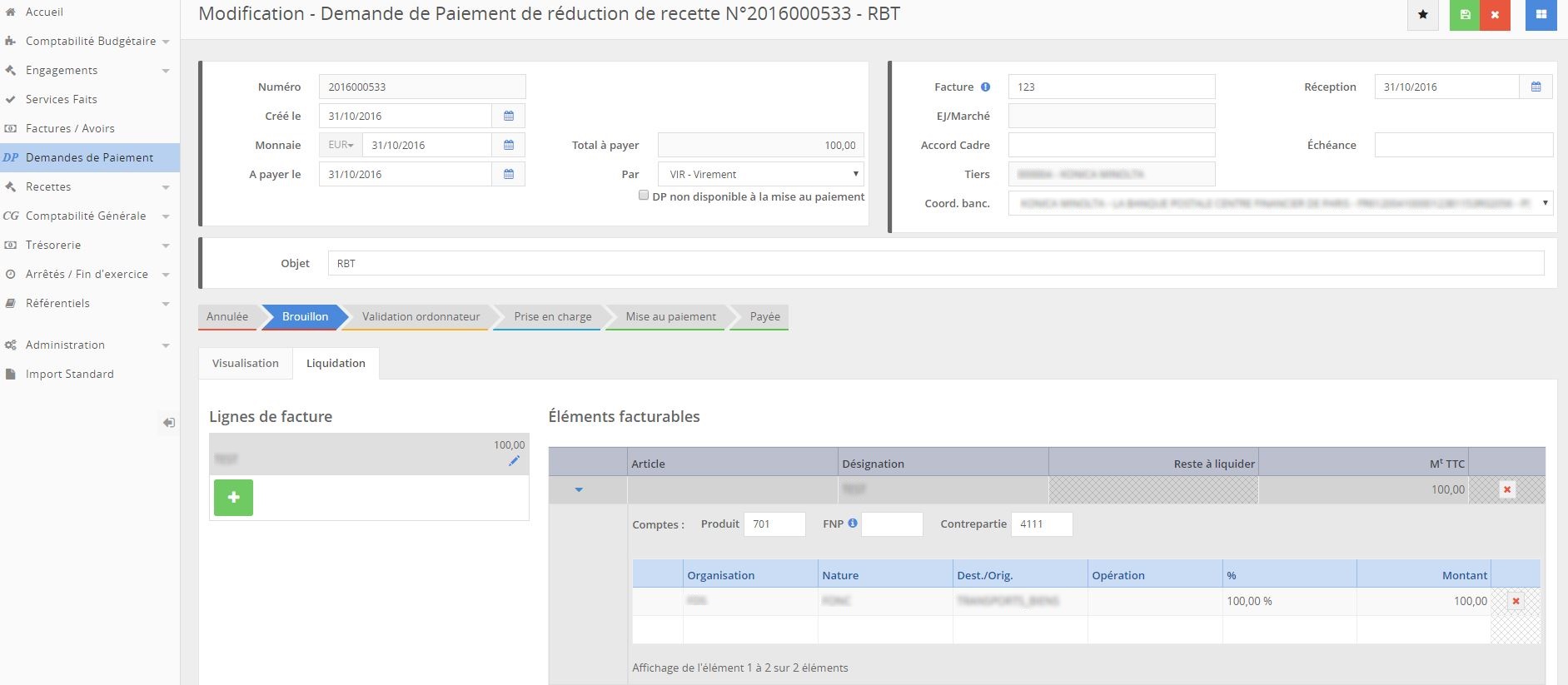 : Le bouton bleu “modifier” permet de modifier une demande de paiement de réduction de recette.